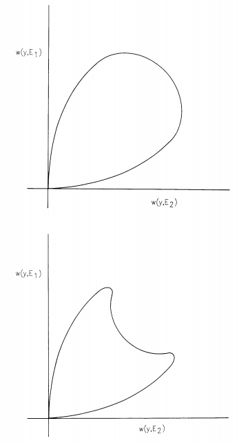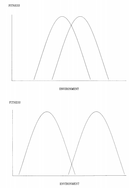 Consider how environmental variations affect growth rates (fitness) by examining the simple case of environments that fluctuate between two kinds of patches either spatially or temporally. Figure 5.2 displays hypothetical fitness functions for two cases. In the top panel, the fitness functions for the two kinds of patches overlap considerably, meaning that the two kinds of patches impose similar adaptation demands. In the bottom panel, the’overlap is small, meaning that the two kinds of patches pose very different adaptive demands—high fitness in one environment precludes high fitness in the other. Now consider many different kinds of populations with differing levels of fitness in the two kinds of patches. Levins represented fitness sets with curves like those in Figure 5.3, whose axes represent fitness in the two kinds of patches. Each population, with a fixed pair of fitness values in the two patches, is a point in the fitness set. The boundaries of the fitness sets are the points of maximum fitness. In the top panel, which represents the fitness sets for the curves in the top part of Figure 5.2, the fitness set is convex along its upper right boundary. That is, all straight lines connecting points in the fitness set fall within the set. The case of dissimilar patches, the bottom panel of Figure 5.3, produces a concave fitness set.