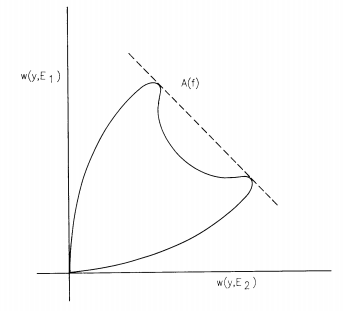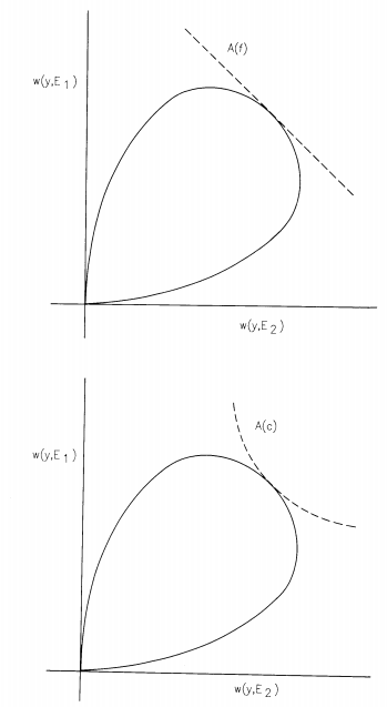 Optimal populations (in this environment) are represented by points on the boundary of the fitness set that are tangent to the highest-valued adaptive function, which are denoted by dashed lines in the figures. These points of tangency indicate the maximal growth rates attainable in the given environment. The evolutionary process is modeled as a selection process that maximizes fitness (growth rates). That is, evolution favors populations whose strategies can be represented as points on the boundary of the fitness sets.