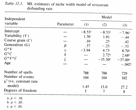 The two point estimates are relevant to the specific hypotheses about fine-grained environments. Hypothesis 2a, that β >0, tells that specialists are favored in fine-grained (non-seasonal) environments. This hypothesis receives no support: β does not differ significantly from zero. Hypothesis 2b, that β + γV >0, means that specialism is favored over generalism over the full range of environmental variation in fine-grained environments. This hypothesis is supported in this analysis. The point estimates imply that the mortality rate of generalists exceeds that of specialists over almost the entire range of V. However, the ratio of the two mortality rates is close to unity at the minimum observed level of V. Perhaps more important is the fact that the point estimate of y differs significantly from zero in the direction predicted. So these results suggest that specialists are favored in fine-grained environments that fluctuate greatly, contrary to the conven-tional view noted at the beginning of the chapter (see also Freeman and Hannan 1983).