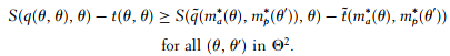 To fix ideas, let us assume that the principal and the agent have respective utility functions V = S(q, θ) − t and U = t − C(q, θ). In this context, the first-best allocation rule a∗(θ) = (t∗(θ), q∗(θ)) is such that