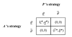 The important point to note is that the same game form must be played by the agent and the principal, whatever the true state of nature θ. Indeed, the state of nature being nonverifiable, the transfers and outputs in each box of the matrix cannot be made contingent upon it. The goal of this mechanism is to ensure that there exists a truthful Nash equilibrium in each state θ that implements the first-best allocation a∗(θ) = (t∗(θ), q∗(θ)).