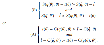 These inequalities have a simple meaning.8 The allocation rule a(·) selects the pair a(θ) = (t(θ), q(θ)) in state θ and not in state θ‘, if there exists another allocation (tˆ, qˆ) such that either the principal or the agent prefers this allocation to a(θ) when the state of nature is θ‘.