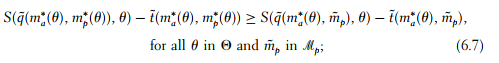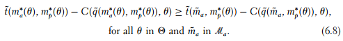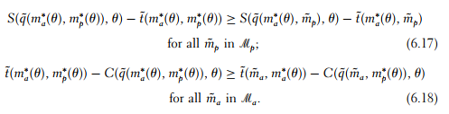According to (6.7), when the principal conjectures that the agent’s strategy is given by ma∗(θ) in state θ, his best response is mp*(θ). Similarly, (6.8) states that the agent’s strategy ma∗(θ) is a best response to the principal’s behavior.
