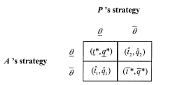 The important point to note is that the same game form must be played by the agent and the principal, whatever the true state of nature θ. Indeed, the state of nature being nonverifiable, the transfers and outputs in each box of the matrix cannot be made contingent upon it. The goal of this mechanism is to ensure that there exists a truthful Nash equilibrium in each state θ that implements the first-best allocation a∗(θ) = (t∗(θ), q∗(θ)).