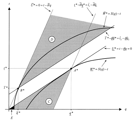 going through B∗, there exists a nonempty subset of D that lies strictly above this indifference curve. All those points obviously lie above the prin- cipal’s indifference curve W ∗ = S(q) − t going through A∗.