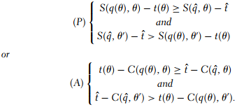 These inequalities have a simple meaning.8 The allocation rule a(·) selects the pair a(θ) = (t(θ), q(θ)) in state θ and not in state θ‘, if there exists another allocation (tˆ, qˆ) such that either the principal or the agent prefers this allocation to a(θ) when the state of nature is θ‘.