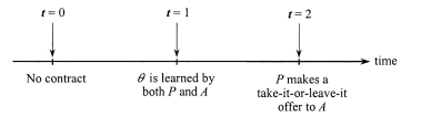 At date t = 1, the principal is informed about θ and can make a take-it-or- leave-it offer to the agent at date t = 2 under complete information. See figure 6.1 for the timing of the game.