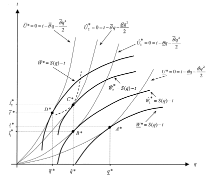 ) should be above (resp. below) the principal’s indifference curve going through C∗. Note that for q > qˆ*, the indifference curves of an agent with (θ, θ¯) have a greater slope than those of an agent with type (θ¯, θ). This helps to construct very easily the out-of-equilibrium allocations