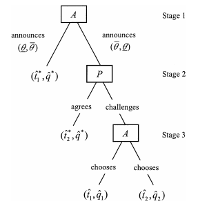 The mechanism to be played in both states (θ, θ¯) and (θ¯, θ) is a three-stage game with the agent moving first and announcing whether (θ, θ¯) or (θ¯, θ) has been realized. If (θ, θ¯) is announced, the game ends with the allocation