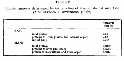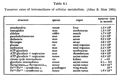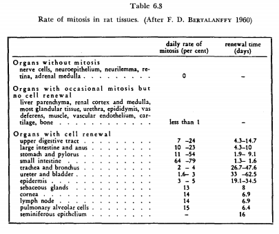 There is, first, the large field of Goethe’s Stirb und werde, the continuous decay and regeneration, the dynamic structure of living systems at all levels of organization (Tables 6.1-6.3). Gen-erally it may be said that this regeneration takes place at far higher turnover rates than was anticipated. For example, it is certainly surprising that calculation on the basis of open system revealed that the proteins of the human body have a turnover time of not much more than a hundred days. Essentially the same is true for cells and tissues. Many tissues of the adult organism are maintained in a steady state, cells being continuously lost by desquamation and replaced by mitosis (F. D. Bertalanffy and Lau, 1962). Techniques such as the application of colchicine that arrests mitosis and thus permits counting of dividing cells over certain periods, as well as labelling with tritiated thymidine, have revealed a sometimes surprisingly high renewal rate. Prior to such investigations, it was hardly expected that cells in the digestive tract or respiratory system have a life span of only a few days.