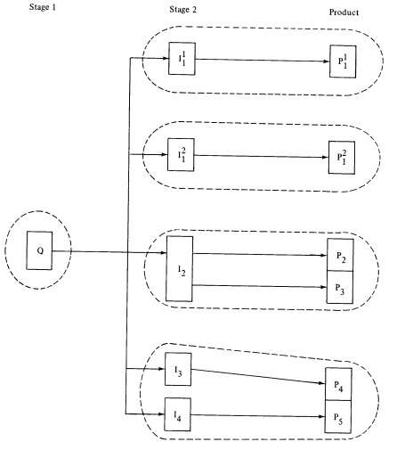 Suppose there are three activity stages: an early production stage, an intermediate stage in which production is completed, and a marketing stage. Assume that all products originate in a common first stage, that there are four distinct intermediate stage processes, and that there are five distinct final products. That there ought, under these circumstances, to be five divisions, one associated with each final product, is uncertain. For one thing, the economies of scale at the first stage may be sufficient to warrant that all production originate in a single, indecomposable plant. Second, if for some products economies of scale at the second stage are slight in relation to the size of the market, parallel divisionalization may be feasible. Third, even though products may be distinct, there may be interaction effects to consider. (For example, products may be complements.)