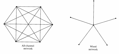 Peer group organization can be limited for bounded rationality reasons in both communication and decision-making respects. These are not matters with which the New Left literature has been greatly, or even often casually, concerned.23 Contrasting the all-channel network with the wheel,24 as shown in Figure 4, is useful for developing both points.