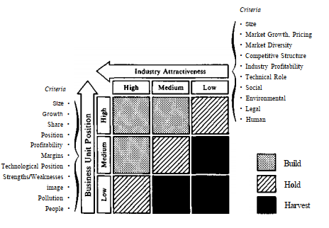 Another technique is the three-by-three matrix variously attrib-uted to General Electric, McKinsey and Company, and Shell. One representative variation of this technique is shown in Figure A-2. The two axes in this approach are the attractiveness of the industry and the strength, or competitive position, of the business unit. Where a particular business unit falls along these axes is determined by an analysis of that particular unit and its industry, using criteria like those listed in Figure A-2. Depending on where a unit falls on the matrix, its broad strategic mandate is either to invest capital to build position, to hold by balancing cash generation and selective cash use, or to harvest or divest. Expected shifts in industry attrac-tiveness or company position lead to the need to reassess strategy. A firm can plot its portfolio of businesses on such a matrix to insure that the appropriate allocation of resources is made. The firm can also try to balance the portfolio in terms of its mix of developing and developed businesses and the internal consistency of cash generation and cash use.