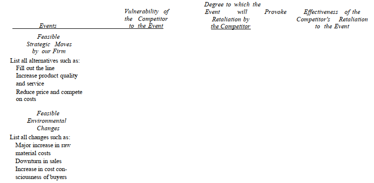 Figure 3-3 presents a simple schematic diagram for analyzing a competitor’s defensive capabilities. The left-hand column lists first the feasible strategic moves some firm might make and then the envi-ronmental and industry changes that could possibly occur (including probable moves by competitors). These events can then be subjected to the questions listed across the top. The resulting matrix should help pick the most effective strategy, given the reality that competi-tors will respond, and can facilitate rapid response to industry and environmental events that will expose a competitor’s weaknesses. (Concepts for making competitive moves are discussed in detail in Chapter 5.)