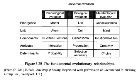 The concept of relationship is basic in the natural philosophy of Salk. It brings together the three dimensions of space and that of time building a fifth dimension of wholeness. If the fundamental units of the three main phases of evolution are defined as atom, cell and mind, a more detailed table regarding the critical determinants of change can be constructed. According to Salk these are probability, necessity and choice; they are represented by their corresponding attributes for each stage, namely interactivity, procreativity and creativity. See Figure 3.25.
