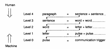 Being occupied only with the first two levels of the hierarchy, Shannon’s theory concerns the binary pattern representing the letters (coding). Effects of intervening noise occurring in the channel and the application of redundancy to neutralize the subsequent existing errors are also dealt with. The hardware is totally indifferent to the choice of letters used. The combining of these letters to create words is directed not by the hardware but by the rules of the language and the linguistic customs of the human user who wishes to be understood. Words are then arranged into sentences according to the syntax of the language and these in turn may be further arranged in paragraphs to emphasizing and distinguishing different topics.