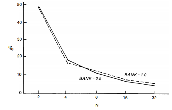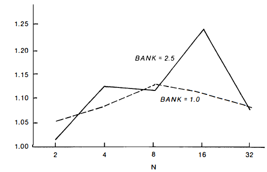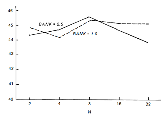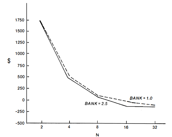 Figures 12.1-12.6 show various performance variables as a function of initial structure. The solid line shows pverage performance of the five runs in which the firms had considerable access to bank credit (BANK = 2.5). The dotted line shows average performance when bank credit was more limited (BANK = 1.0). All values shown are at the end of the run and are means over five runs.