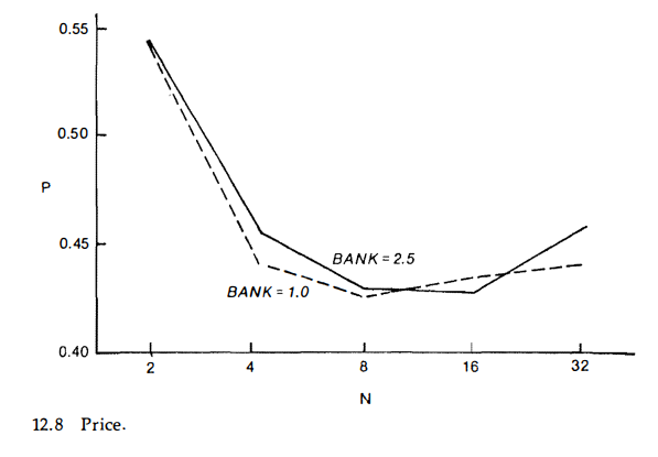 Figure 12 .8 shows end-of-run price in the industry as aU-shaped function of the number of firms. Up to a point, in these runs at least, the lower margin, which is associated with more competitive struc ture, more than offsets the higher unit production costs. However, the curve appears to turn upward as the industry gets very competi tive. Beyond eight firms, the additional competition yields only lim ited gains in terms of lower margins, and further deconcentration en tails costs in terms of lower average productivity.