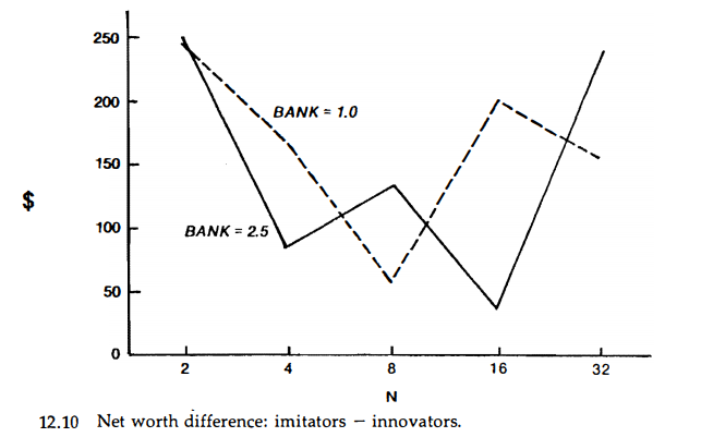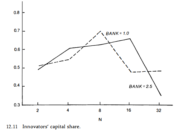 A straightforward application of the selection argument would lead one to expect, given the profitability differential, that the firms that undertook innovative R&D would be driven out of business. Figure 12.11 shows that this is too simple. Despite their relative un profitability compared with firms that did only imitative R&D, in the small- numbers cases the innovators accounted for more than half of the industry’S capital stock toward the end of the run. Only in the thirty-two-firm case was the unprofitability of innovative R&D clearly reflected in the innovators’ capital share.