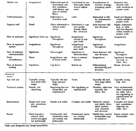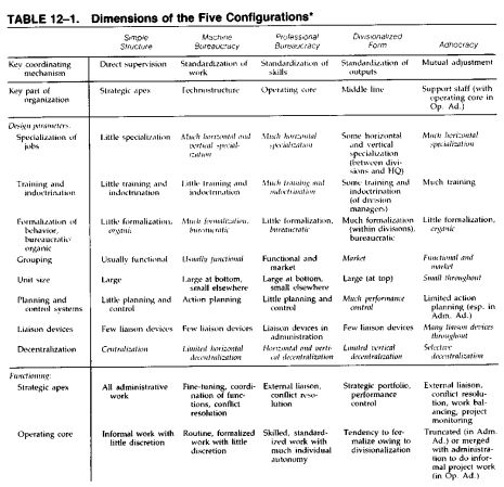 To reiterate a central theme of our discussion throughout this book: in general, there is no one best structure; in particular, there may be, as long as the design parameters are internally consistent and together with the situational factors form a coherent configuration. We have delineated five such configurations in this last section of the book; their dimensions are summarized in Table 12-1.