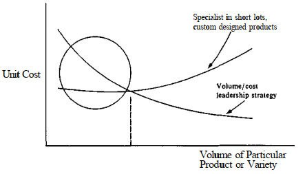 The firm explicitly designing its manufacturing process for flex-ibility, rapid setups, and short lots (general purpose, computer-con-trolled machines, for example) may well enjoy cost advantages over the high-volume producer for servicing custom orders or small lots. A viable strategy in such a situation is to focus on orders in the cir-cled area of Figure 11-1. Cost curve differences allowing such a strategy may be based on small orders, custom orders, particular small-volume product varieties, and others. Wickham Skinner has described how such manufacturing strategies can be implemented in his concept of the “focused factory.”5