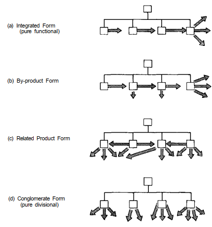 We begin with the large corporation that produces all its products through one chain and so retains what we call the integrated form—a pure functional structure, a Machine Bureaucracy or perhaps an Adhocracy. As the corporation begins to market somie of the intermediate products of its production processes, it makes the first shift toward divisionalization, called the by-product form. Further moves in the same direction, to the point where the by-products become more important than end products although a central theme remains in the product-market strategy, lead to a structure closer to the divisionalized one, which is called the related- product form. And finally, the complete breakdown of the production chain, to the point where the different products have no relationship with each other, takes the corporation to the conglomerate form, a pure divi- sional structure. Although some corporations may move through all these stages in sequence, we shall see that others stop at one stage along the way because of very high fixed-cost technical systems (typical in the case of the integrated form), operations based on a single raw material (typical in the case of the by-product form), or focus on a core technology or market theme (typical in the case of the related-product form).