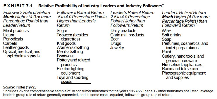 Empirical evidence suggests that the relationship between the profitability of larger share and smaller share depends on the indus-try. Exhibit 7-1 compares the rate of return on equity of the largest firms accounting for at least 30 percent of industry sales (leaders) to the rate of return on equity of the medium-sized firms in the same in-dustry (followers). In this calculation small firms with assets less than $500,000 were excluded. Although some of the industries in the sample are overly broad, it is striking that followers were noticeably more profitable than leaders in 15 of 38 industries. The industries in which the followers’ rates of return were higher appear generally to be those where economies of scale are either not great or absent (clothing, footwear, pottery, meat products, carpets) and/or those that are highly segmented (optical, medical and ophthalmic goods, liquor, periodicals, carpets, and toys and sporting goods). The in-dustries in which leaders’ rates of return are higher seem to be gen-erally those with heavy advertising (soap; perfumes; soft drinks; grain mill products, i.e., cereal; cutlery) and/or research outlays and production economies of scale (radio and television, drugs, photo-graphic equipment). This outcome is as we would expect.