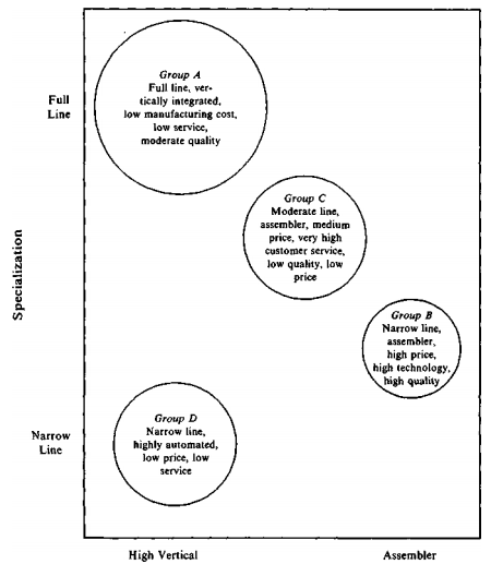 The first step in structural analysis within industries is to char-acterize the strategies of all significant competitors along these di-mensions. This activity then allows for the mapping of the industry into strategic groups. A strategic group is the group of firms in an in-dustry following the same or a similar strategy along the strategic di-mensions. An industry could have only one strategic group if all the firms followed essentially the same strategy. At the other extreme, each firm could be a different strategic group. Usually, however, there are a small number of strategic groups which capture the essen-tial strategic differences among firms in the industry. For example, in the major appliance industry one strategic group (with GE as the prototype) is characterized by broad product lines, heavy national advertising, extensive integration, and captive distribution and serv-ice. Another group consists of specialist producers like Maytag fo-cusing on the high-quality, high-price segment with selective distri-bution. Another group (like Roper and Design and Manufacturing) produces unadvertised products for private label. One or two addi-tional groups might be identified as well.