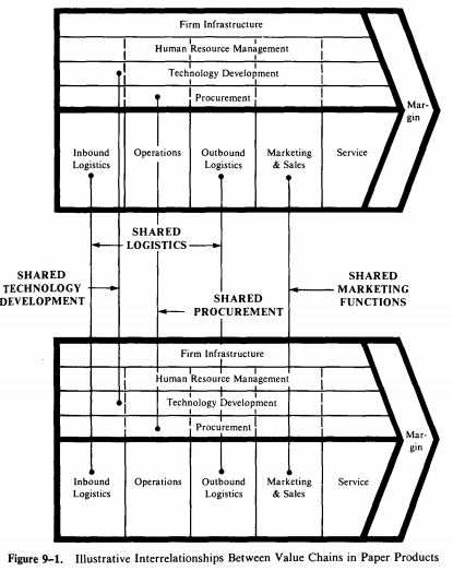 The value chain provides the starting point for the analysis of tangible interrelationships. A business unit can potentially share any value activity with another business unit in the firm, including both primary and supporting activities. For example, Procter & Gamble enjoys interrelationships between its disposable diaper and paper towel businesses. Certain raw materials can be procured and handled jointly, the development of technology on products and processes is shared, a joint sales force sells both products to supermarket buyers, and both products are shipped to buyers via the same physical distribution system. The interrelationships are shown schematically in Figure 9-1. As this example illustrates, tangible interrelationships between two business units can involve one or many value activities. If most value activities are shared between two business units, however, they are not strategically distinct business units but in fact one business unit.