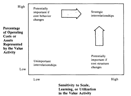 Figure 9 -2 illustrates how these principles can be used to highlight activities where sharing is potentially im portant to cost position. Inter relationships involving value activities in the upper right-hand quad rant of the diagram are of potentially greatest significance due to their large costs and sensitivity to scale, learning, or utilization. Interrela tionships involving value activities in the upper left-hand quadrant are not currently im portant because sharing will not reduce cost, though the value activities represent a large fraction of costs or assets. However, changes in the technology for performing such activities can quickly make interrelationships crucial if their cost becomes more sensitive to scale, learning, or utilization. The change in order process ing technology from manual systems to on-line computers in many distribution industries, for example, has begun to create important advantages from sharing order processing across related product lines. Interrelationships involving value activities in the lower right-hand quadrant can become im portant for cost position if changes in the cost structure raise the percentage of operating costs or assets they represent. The increasing capital cost of a plant and supporting infra-structure, for example, will raise the potential advantage of sharing facilities.
