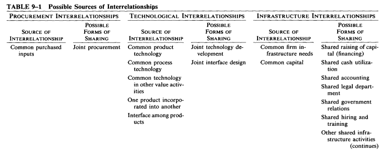 To aid in identifying the tangible interrelationships present in a firm, a useful starting point is to catalog all the forms of sharing that occur in practice as well as the alternative ways they can create competitive advantage. Figure 9-3 divides forms of sharing into five categories: production, market, procurement, technology, and infra structure. I have included shared human resource management as part of shared infrastructure. It is useful to separate these categories of interrelationships because they raise different issues in sharing. Inter relationships ultimately stem from commonalities of various types among industries, such as common buyers, channels, or production processes. These commonalities define potential interrelationships; whether the interrelationships lead to a competitive advantage is a function of the benefits and costs described earlier. The sources of each category of interrelationship and the possible forms of sharing to capture it are shown in Table 9-1.