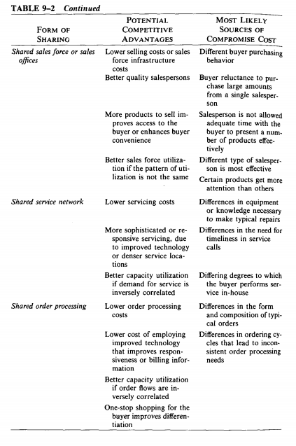 Market interrelationships involve the sharing of primary value activities involved in reaching and interacting with the buyer, from outbound logistics to service. W hen business units have only the geo graphic location of their buyers in common, sharing is usually restricted to physical distribution systems, order processing, and to servicing and sales if the products have similar sales and servicing needs. Richer opportunities for sharing are present when business units also have common buyers, common channels, or both. If buyers or channels are the same, sharing of physical distribution or order processing sys tems among business units usually involves less complexity and lower costs of sharing. In addition, common buyers or channels open up a wide variety of other possible forms of sharing shown in Table 9-1.