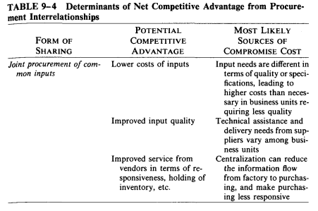 Procurement interrelationships involve the shared procurement of common purchased inputs. Common inputs are frequently present in diversified firms, particularly if one looks beyond m ajor raw materi als and pieces of capital equipment. Suppliers are increasingly willing to make deals based on supplying the needs of plants located around the world, and negotiate prices reflecting total corporate needs. Some firms go overboard in shared procurements, however, because they fail to recognize the potential costs of compromise or they establish a rigid procurement process that does not allow for opportunism in negotiating attractive opportunities.
