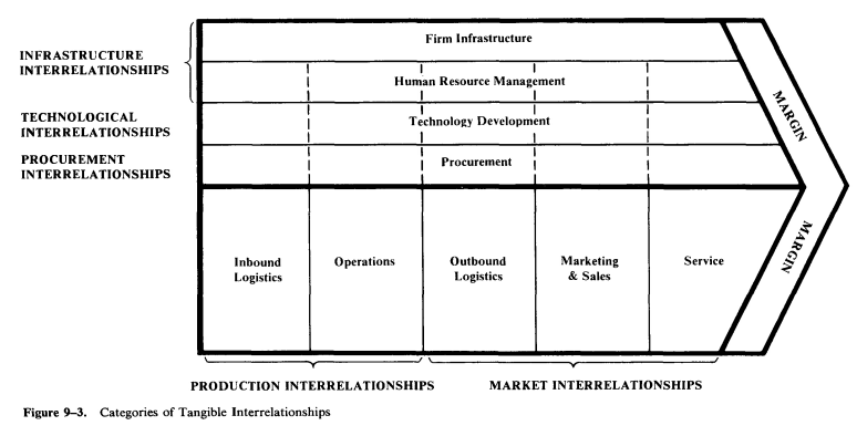 Technological interrelationships involve the sharing of technology development activities throughout the value chain. They are distin guished from production interrelationships because their impact is on the cost or uniqueness of technology development, while production interrelationships involve sharing activities involved in the actual pro duction of the product on an ongoing basis. It is im portant to recognize, however, that interrelationships in process development often occur together with production or m arket interrelationships. Interrelation ships in process technology typically grow out of interrelationships in the primary activities.