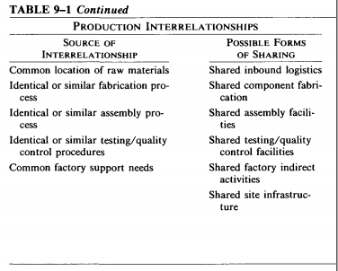 To aid in identifying the tangible interrelationships present in a firm, a useful starting point is to catalog all the forms of sharing that occur in practice as well as the alternative ways they can create competitive advantage. Figure 9-3 divides forms of sharing into five categories: production, market, procurement, technology, and infra structure. I have included shared human resource management as part of shared infrastructure. It is useful to separate these categories of interrelationships because they raise different issues in sharing. Inter relationships ultimately stem from commonalities of various types among industries, such as common buyers, channels, or production processes. These commonalities define potential interrelationships; whether the interrelationships lead to a competitive advantage is a function of the benefits and costs described earlier. The sources of each category of interrelationship and the possible forms of sharing to capture it are shown in Table 9-1.