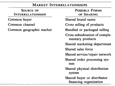 Market interrelationships involve the sharing of primary value activities involved in reaching and interacting with the buyer, from outbound logistics to service. W hen business units have only the geo graphic location of their buyers in common, sharing is usually restricted to physical distribution systems, order processing, and to servicing and sales if the products have similar sales and servicing needs. Richer opportunities for sharing are present when business units also have common buyers, common channels, or both. If buyers or channels are the same, sharing of physical distribution or order processing sys tems among business units usually involves less complexity and lower costs of sharing. In addition, common buyers or channels open up a wide variety of other possible forms of sharing shown in Table 9-1.