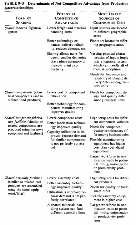 Production interrelationships can be illusory when apparently sim ilar value activities are examined closely. For example, though the machines themselves are generically the same, a job-shop manufactur ing process for one product may involve different machine tolerances than another, or lot sizes or run lengths can be quite different. As with market interrelationships, indirect value activities offer particu larly attractive opportunities for sharing because the compromise costs are often low. For example, such activities as building operations, maintenance, site infrastructure, and testing laboratories can be shared despite the fact that the actual m anufacturing processes are different. Table 9-3 shows the potential competitive advantages of important forms of production interrelationships, and the likely sources of compromise cost. The balance will depend on the strategies of the involved business units. For example, two business units with differenti ation strategies are more likely to have similar needs in terms of compo nent specifications, manufacturing tolerances, and testing standards than if one business unit pursues cost leadership while another offers a premium product.