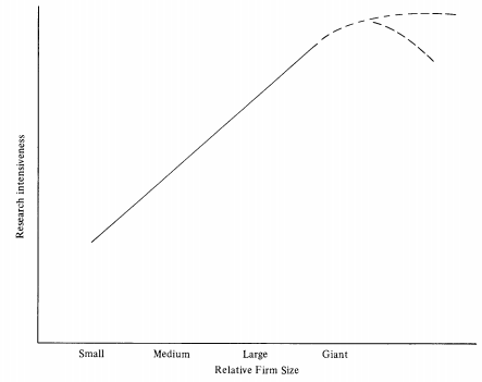Mansfield approached the matter by posing a somewhat different question. He examined R & D expenditures (expressed as a percent of sales) of the very largest firms in relation to their large but not giant-sized rivals in the chemical, petroleum, drug, steel, and glass industries. “Except for the chemical industry, the results provide no evidence that the largest firms in these industries spent more onR & D, relative to sales, than did somewhat smaller firms. In the petroleum, drug, and glass industries, the largest firms spent significantly less; in the steel industry, they spent less but the difference was not statistically significant” (1968, pp. 94-95). Scherer also found that, among a wider class of industries, the R & D intensity of the largest firms did not usually exceed that of their upper middle-sized rivals. He observed that the data do not support the contention that “gigantic scale is … an essential condition for vigorous industrial research and development activity: . . . bigness may indeed be a stifling factor” (1965, p. 265).
