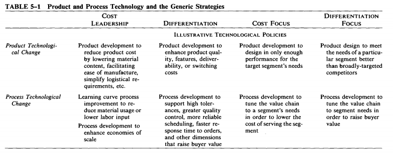 Another important observation from Table 5-1 is that both product and process technological change can have a role in supporting each of the generic strategies. Firms often incorrectly assume that process technological change is exclusively cost-oriented and product technological change is intended solely to enhance differentiation. Chapter 3 has shown how product technology can be critical in achieving low cost, while Chapter 4 has shown how changes in process technology may be the key to differentiation (a favorite tactic of Japanese companies).