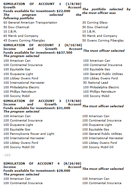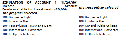 In order to test the model’s ability to reproduce the actual behavior of the trust investor — i.e., to simulate the trust investment process — the model was required to select portfolios for a specific set of actual trust accounts. In particular, the model was required to generate portfolios for four accounts with which the trust officer had dealt but which were not used in developing the model. These portfolios are presented below along with the selections made by the trust officer for the same accounts. The generated portfolios were then compared with portfolios generated by various random and naive models. The results of these tests indicate that the trust investment program selected a greater proportion of correct securities than did any one of the alternative models.