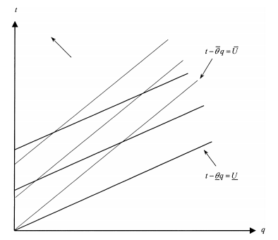 In figure 2.2, we draw the indifference curves of a θ-agent (heavy curves) and of a θ-agent (light curves) in the (q,t) space. The isoutility curves of both types cor-respond to increasing levels of utility when one moves in the northwest direction. These indifference curves are straight lines with a slope θ corresponding to the agent’s type. Since