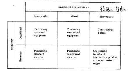 As discussed above, the principal dimensions for describing transactions are asset specificity, uncertainty, and frequency. It will facilitate the argument in this section to assume that uncertainty is present in sufficient degree to pose an adaptive, sequential decision requirement and to focus on asset specificity and frequency. Three frequency classes—one-time, occasional, and recurrent—and three asset specificity classes—nonspecific, mixed, and highly specific—will be considered. To simplify the argument further, the following assumptions are made: (1) Suppliers and buyers intend to be in business on a continuing basis; thus the special hazards posed by fly-by-night firms can be disregarded. (2) Potential suppliers for any given requirement are numerous—which is to say that ex ante monopoly in ownership of specialized resources is assumed away. (3) The frequency dimension refers strictly to buyer activity in the market. (4) The investment dimension refers to the characteristics of investments made by suppliers.