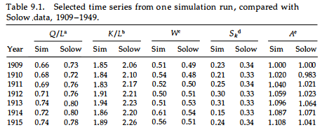 The answer depends on the particular simulation run from which the data are taken and on the particular test. But by and large it seems that he would believe that his theory had performed well. (Of course, if he also looked at the microeconomic data and observed the inter firm dispersion of techniques and differential growth rates, he might ponder a bit whether his theory really characterized what was going on. But the pondering would likely conclude with the consoling thought that macro theories need not square with micro observa tions.)