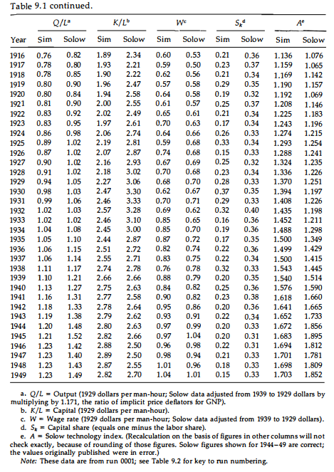 How do the aggregative time series look? In a word, plausible. In Table 9.1 the results of one simulation run and the real data ad dressed by Solow are displayed side by side. There is, of course, no reason to expect agreement between the real and simulated data on a year-to-year basis. The simulation run necessarily reflects nonhis-torical random influences. But more than that, and of particular im portance to this comparison, the simulation model, unlike Solow’s analysis of the real data, generates its own input history on the basis of very simple assumptions about behavior and institutional struc ture . The real period in question involved eposides of economic de pression and war, and while these episodes might be considered as historical random events, the simulation model is not p repared to deal with them realistically. The same trend in the labor force, the same Say’s Law assumption, the same link of investment to retained earnings persist year by year. Since the model’s historical accuracy is so sharply limited by these considerations we have not attempted to locate parameter settings that would, in any sense, maximize simi larity to the real time series. For example, it would have been easy to assure a better match of initial conditions.