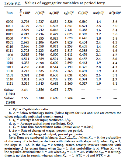 Table 9.2 presents d ata on each run for each of several variables, observed at period forty of the run.4 Also displayed are the corre sponding figures, where these exist, for the thirty-sixth period (1944) and the fortieth period (1948) of the Solow data. Given the experi mental design, it is convenient to distinguish the runs by numbering them in the binary system. The interpretive key to this numbering is explained in the note to Table 9.2.
