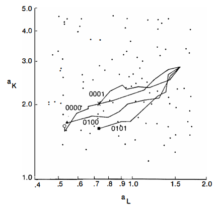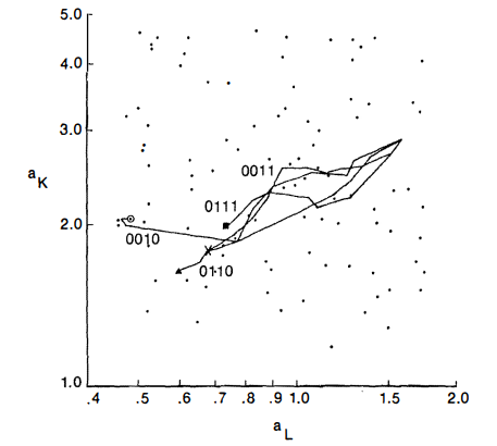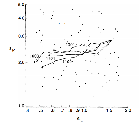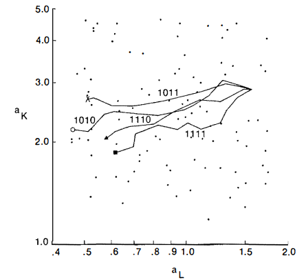 Figures 9.2-9.5 display the time paths of the average input coefficients generated by the sixteen runs. To keep the figures relatively uncluttered , the values are plotted for the initial period and at periods 5, la, and so on thereafter. In Figure 9.6 the input coefficient track for one run (11 10) is compared with the track implied in the Solow data. The case shown is one in which there is close agreement at the initial point, and also forty periods later, but there is a wide di vergence in between. The divergence is associated with the fact that, while the simulated track gives the impression of taking a relatively constant direction, there is a sharp turn in the track of the real data, suggestive of a change in the underlying regime. The apparent break occurs between 1929 and 1934 . Perhaps it would be asking too much of the simulation model, committed as it is to fu. ll employment, to reproduce that b reak.