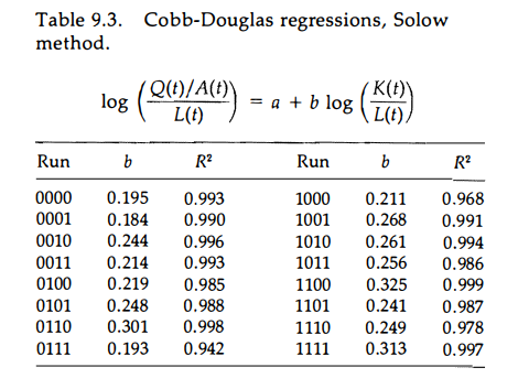 The most noteworthy feature of these results is that the fits ob tained in most of the cases are excellent: half of the R2 values in Table 9.3 exceed 0. 99, and more than half of those in Table 9.4 equal 0. 999 . The fact that there is no production function in the simulated economy is clearly no barrier to a high degree of success in using such a function to describe the aggregate series it generates. It is true that the fits obtained by Solow and others with real data are at least as good as most of ours, but we doubt that anyone would want to rest a case for the aggregate production function on what happens in the third or fourth decimal place of R2. Rather, this particular contest between rival explanatory schemes should be regarded as essentially a tie, and other evidence consulted in an effort to decide the issue.