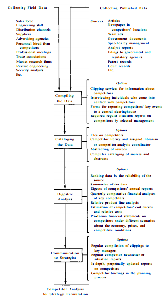 One observes a variety of alternative ways firms organize to per-form these functions in practice. They range from a competitor anal-ysis group that is part of the planning department and performs all the functions (perhaps drawing on others in the organization for col–lecting field data); to a competitor intelligence coordinator who per-forms the compiling, cataloging, and communication functions; to a system in which the strategist does it all informally. All too often, however, no one is made responsible for the competitor analysis at all. There seems to be no single correct way to collect competitor data, but it is clear that someone must take an active interest or much useful information will be lost. Top management can do a lot to stimulate the effort by requiring sophisticated profiles of competi-tors as part of the planning process. As a minimum, some manager with the responsibility to serve as the focal point for competitor in-telligence gathering seems to be necessary.