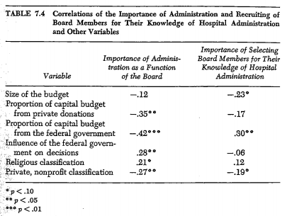 The size of the board is also predicted by the context of the hospital and the function the board is expected to serve. As we argued for the boards of corporations, board size is determined by the organi-, zation’s need for integration with the environment. The greater the need for effective external linkage, the larger the board should be. For this sample of hospitals, the size of the board was positively associated with the size of the hospital (r = .59, p < .001) and was also associated with the importance of the function of the board for fund raising (r = .46, p C .001) and with the hospital being classified as private, nonprofit (r = .39, p < .005). Hospital boards were smaller to the extent that administration was perceived as a more important function of the board. .