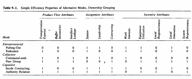- Modes are listed roughly in the same order as they appeared histor- Although it is possible to argue that later modes displaced earlier modes because the “interests” were determined to stamp out autonomy, an alternative hypothesis is that successor modes have superior efficiency properties to predecessor modes. The progression from Putting-Out to Inside Contracting to the Authority Relation is especially noteworthy in that respect.